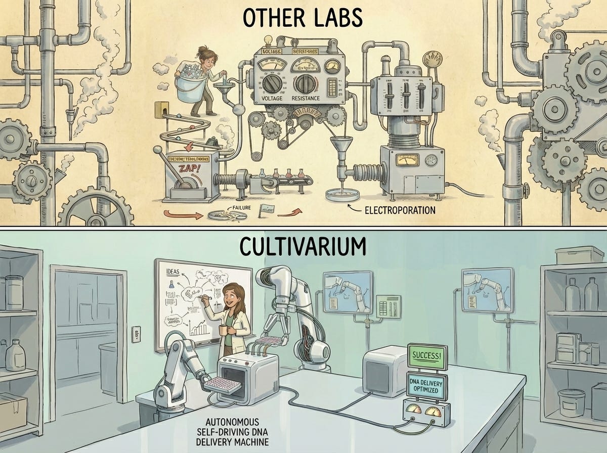 Using this self‑driving DNA delivery system, we improved electroporation for Cupriavidus necator by 8.6× over the published protocol—first described 31 years ago—in just three weeks. The updated method is available in our preprint for researchers working on bioplastics, carbon capture, valorization, and bioremediation.