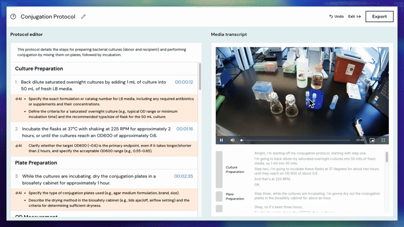The result is a detailed multimodal protocol that others can read, listen to, and watch to see how an expert handles each step. When a protocol says "resuspend cells," viewers can observe the precise pipetting technique. When it mentions checking for contamination, they can see what contamination actually looks like in that specific experimental context.